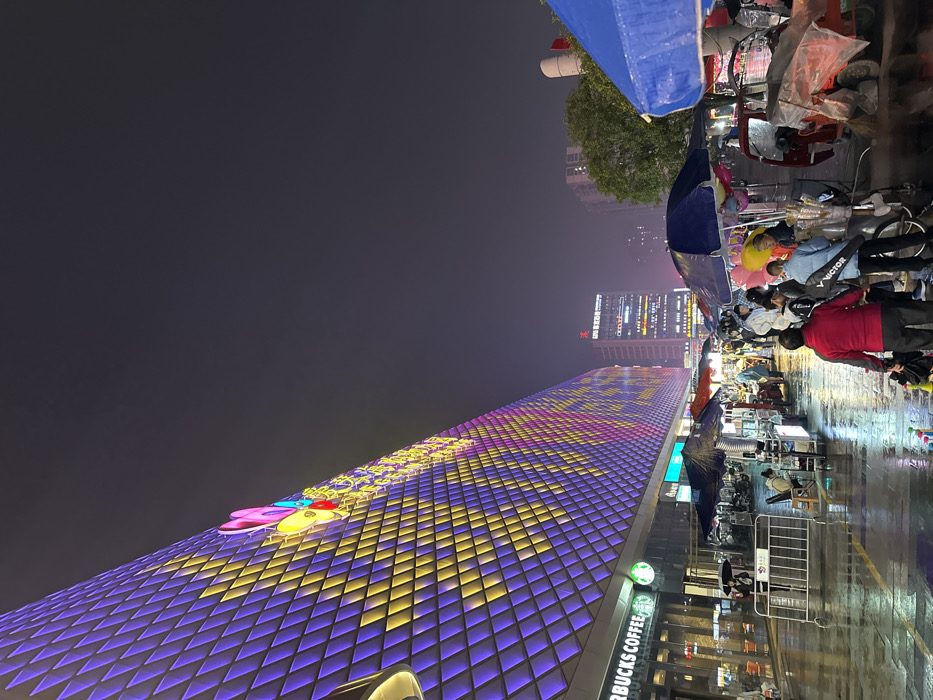 The image depicts a nighttime street scene in Shuangfu, China, characterized by a wet, reflective paved surface, indicating recent rain. On the left, a large, modern multi-story building features a geometrically patterned facade illuminated by purple and yellow lights arranged in a grid. A vibrant, multi-colored neon sign, resembling a flower or abstract shape, is prominently displayed on the upper section of this building. Its ground floor hosts commercial establishments, including a "Starbucks Coffee" with its green logo and an "ASES" sign. Adjacent to this building, a bustling street market extends into the midground. Numerous vendors operate under various sized umbrellas, primarily blue and black, protecting their stalls and merchandise. These stalls appear to offer diverse goods, including food items from carts equipped with cooking apparatus, and colorful balloons. Several people are present, walking, congregating around the vendor stalls, and interacting with vendors. Some individuals are holding open umbrellas. On the right, several three-wheeled motorized vehicles, commonly used by vendors, are parked, with at least one red vehicle partially covered. Metal crowd control barriers are visible on the left, separating the main walkway from the building's entrance area. In the background, taller illuminated buildings pierce the dark, hazy sky, and some sparse greenery is visible behind the market stalls.