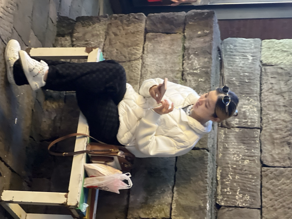 - "A young East Asian female is seated on a white and green painted wooden bench, against a backdrop of a rough-hewn stone wall, in an urban setting consistent with Yuzhong District, China" by FM-KHzZx1, licensed under CC BY 4.0