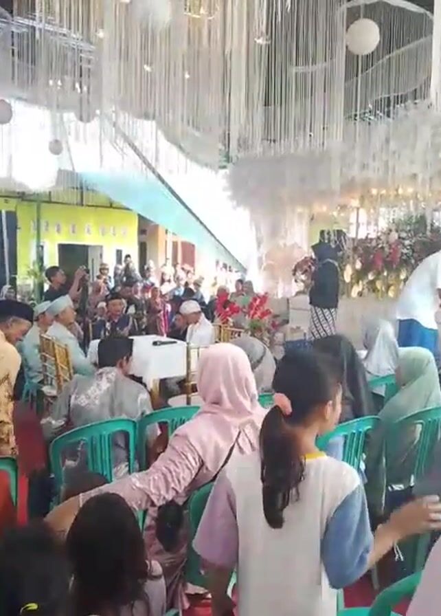 n indoor wedding ceremony. Guests are seated in rows of green plastic chairs, facing the front where a table with white cloth and microphones sits. Attendees are dressed in a variety of clothing styles, including traditional attire and modern casual wear. Some people are wearing head coverings. In the foreground, the backs of attendees’ heads are visible, including a girl with a ponytail. At the front, a speaker is addressing the gathering. Behind the speaker is a decorated stage area with flowers and white decorations. The ceiling is adorned with white streamers and round paper lanterns. The event is taking place under a temporary tent-like structure attached to a green-painted building. Some people are taking photos or videos with their phones.