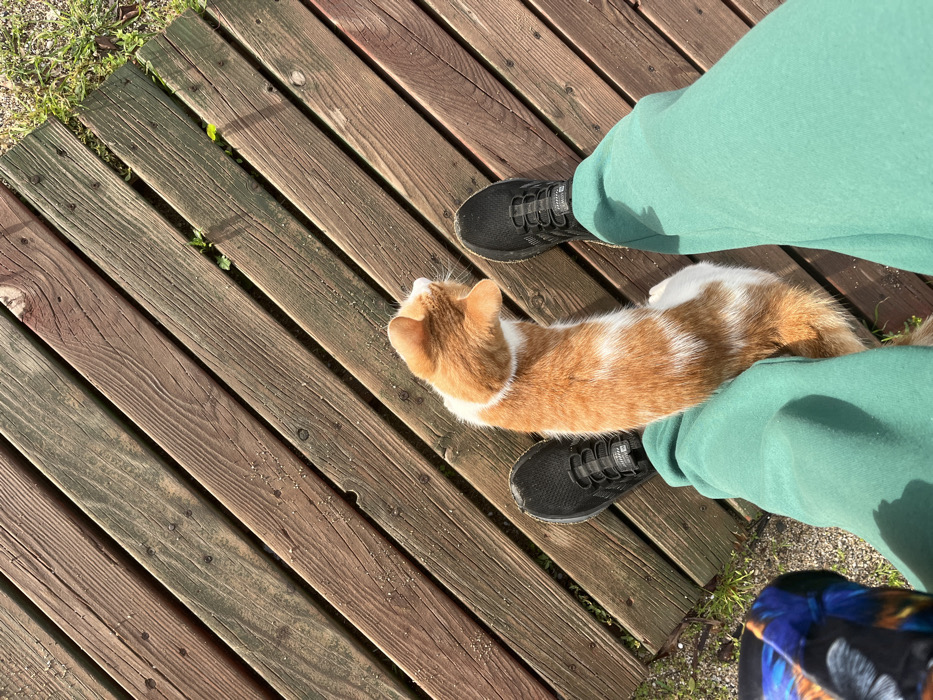An overhead photograph captures a scene on a weathered wooden boardwalk in Alanya, Turkey. A person's lower legs and feet are visible, clad in green sweatpants and black athletic shoes. Positioned directly between the person's feet is an adult domestic short-haired cat, primarily orange with distinct white markings on its chest, belly, and paws. The cat is facing towards the upper right of the frame, its tail visible at the bottom center. The wooden planks of the boardwalk are arranged diagonally from top-left to bottom-right and show signs of wear and granular debris on their surface. Sparse patches of green grass and soil are visible along the edges of the wooden structure. Strong directional light indicates an outdoor setting.