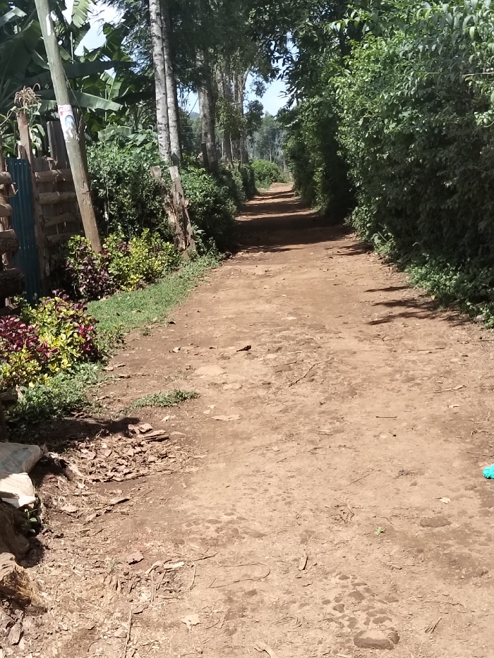 A narrow, dirt path stretches into the distance, framed by lush vegetation. Trees line the left side, their trunks standing tall, while dense green bushes dominate the right. The path itself is uneven, with patches of exposed earth and scattered debris. A fence and more greenery are visible to the left at the start of the path. The sunlight illuminates the path, creating dappled shadows and highlighting the earthy tones of the ground.