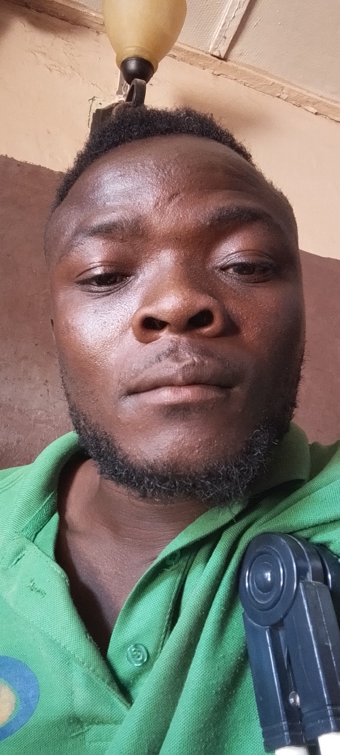 A close-up, front-facing photograph captures an adult male within an indoor setting in the city of Unknown, Unknown. The subject, a male of African descent, possesses dark skin, short dark hair with a faded haircut, and a trimmed beard. His eyes are open, and he maintains direct eye contact with the camera. Visible minor scarring or marks are present on his forehead. He wears a short-sleeved, collared green polo shirt, with the top button unfastened. A circular emblem, partially visible on the left chest of his shirt, features light blue and yellow elements. Above the subject's head, an amber-tinted, bell-shaped light fixture with a black base is affixed to the wall or ceiling. To the lower right of the frame, a black, multi-jointed device, consistent with a folded portable tripod or selfie stick, is visible against the subject's green shirt. The background consists of a plain, light brown wall, topped by a light-colored ceiling trim or molding. The ceiling itself is light-colored and shows minor textural variations.