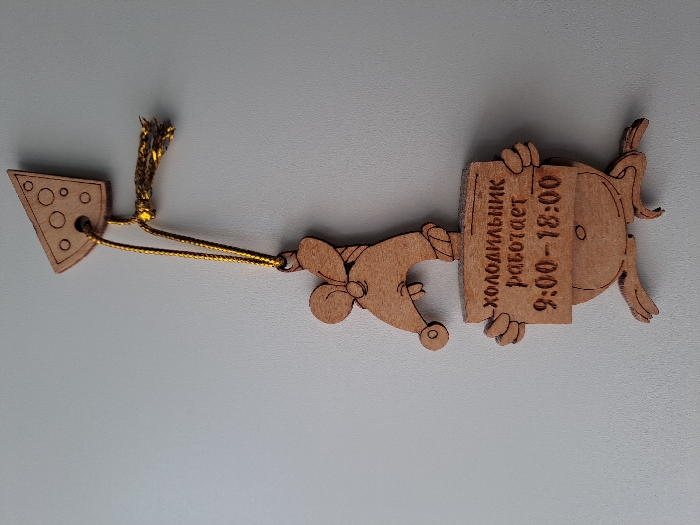 A light-colored wooden decorative ornament, primarily featuring a stylized cartoon mouse, hangs against a smooth, uniform light gray wall. The ornament is suspended by a braided gold string, which is attached at its upper end to a triangular piece of wood carved to resemble a slice of Swiss cheese, complete with multiple circular cutouts. The lower part of the string connects to the head of the mouse figure. The mouse, depicted standing upright, holds a rectangular wooden sign with both hands. The sign bears laser-engraved Russian text: "ХОЛОДИЛЬНИК работает 9:00-18:00", which translates to "REFRIGERATOR works 9:00-18:00". The wood shows characteristic darkened edges consistent with laser cutting. The image provides no visual information or identifying markers to confirm a specific location within the city of Меткомелино, Russia.