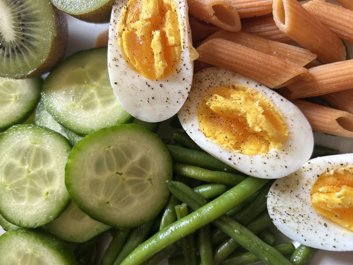 A meal is depicted from a top-down, close-up perspective on a white surface in Châtenay-Malabry, France. The composition includes multiple halved hard-boiled eggs, each displaying a firm white and orange-yellow yolk, seasoned with black specks, likely ground pepper. These eggs are interspersed among a quantity of bright green cooked green beans. To the left, numerous thin, circular slices of cucumber are arranged. In the upper left quadrant, several halved kiwi fruits are visible, showing their green flesh and small black seeds. The upper right section of the plate is filled with reddish-brown penne pasta. No individuals or external environmental details beyond the plated food are present.