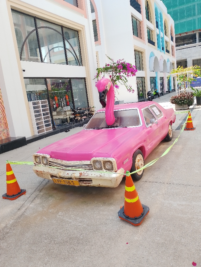 An outdoor scene in Nha Trang, Vietnam, depicts a stationary display featuring a vintage-style sedan. The car is painted a vivid pink, contrasting with its distressed white front bumper, grille, and headlights. A prominent, bright pink flamingo head and neck sculpture extends vertically from the vehicle's windshield area. A yellow license plate, partially visible as "PP-158.5," is mounted on the front bumper. Three orange traffic cones, each marked with two yellow reflective stripes, are positioned on the light-colored paved surface around the front of the car. A bright green strap or tape connects these cones, forming a low barrier. In the background, multi-story buildings with a modern architectural style feature white facades accented with light pink, light blue, and light yellow/beige sections around window frames and arched alcoves. The ground floors house retail spaces with large glass storefronts, one reflecting merchandise racks inside. Potted plants displaying vibrant pink bougainvillea-like flowers are situated near the car and along the walkway. Further in the background, a building section appears to be under construction, partially covered by green scaffolding. The scene is illuminated by bright daylight, casting distinct shadows. No individuals are visibly interacting with the primary display.