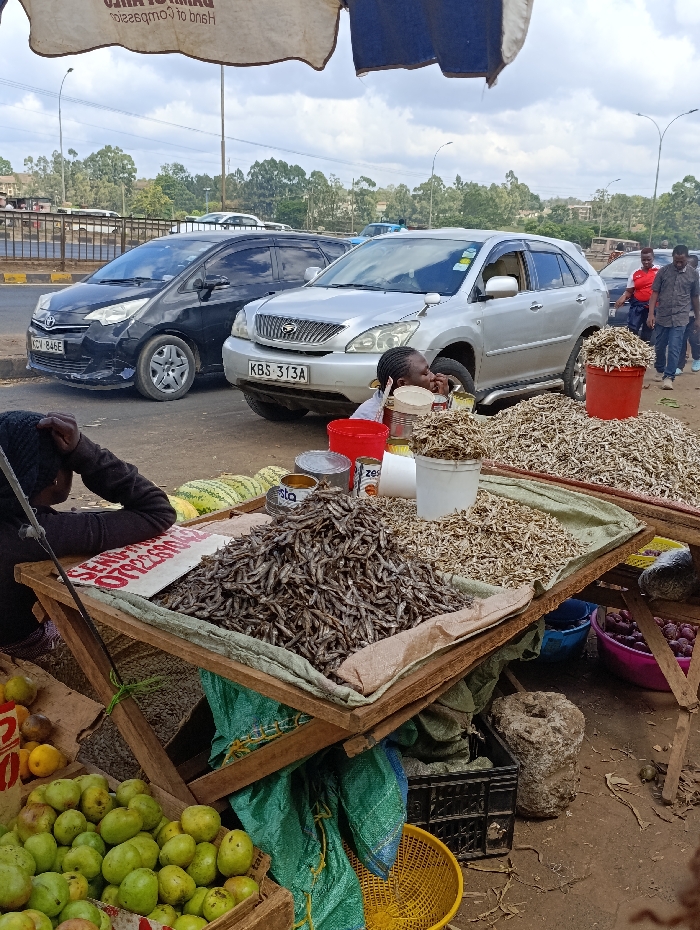 A street-side market displays piles of small dried fish on a wooden table. Nearby, oranges and other produce are offered. Cars pass on a roadway behind the market, including a black Toyota Ractis and a silver SUV. People walk along the side of the road. The market stall is shaded by an umbrella. Cans and containers sit amongst the fish.
