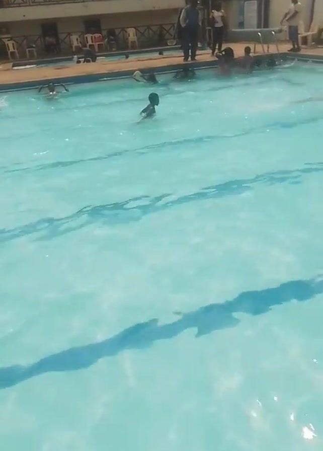 swimming pool with several people in and around it
