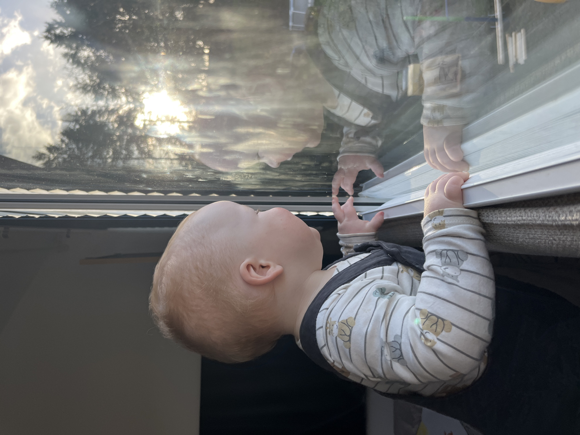 A young child with fair hair and skin is standing and looking out of a window. The child is wearing a light-colored, striped long-sleeved shirt with animal prints and dark overalls. The child's hands are resting on the window frame. The window reflection shows a blurred image of the child and the outside scene, including trees, sky, clouds, and sunlight. The setting appears to be inside a building, possibly a home. The child is interacting with the window by looking and touching it. There is no information about the city of Gangloff, Germany, in this image.