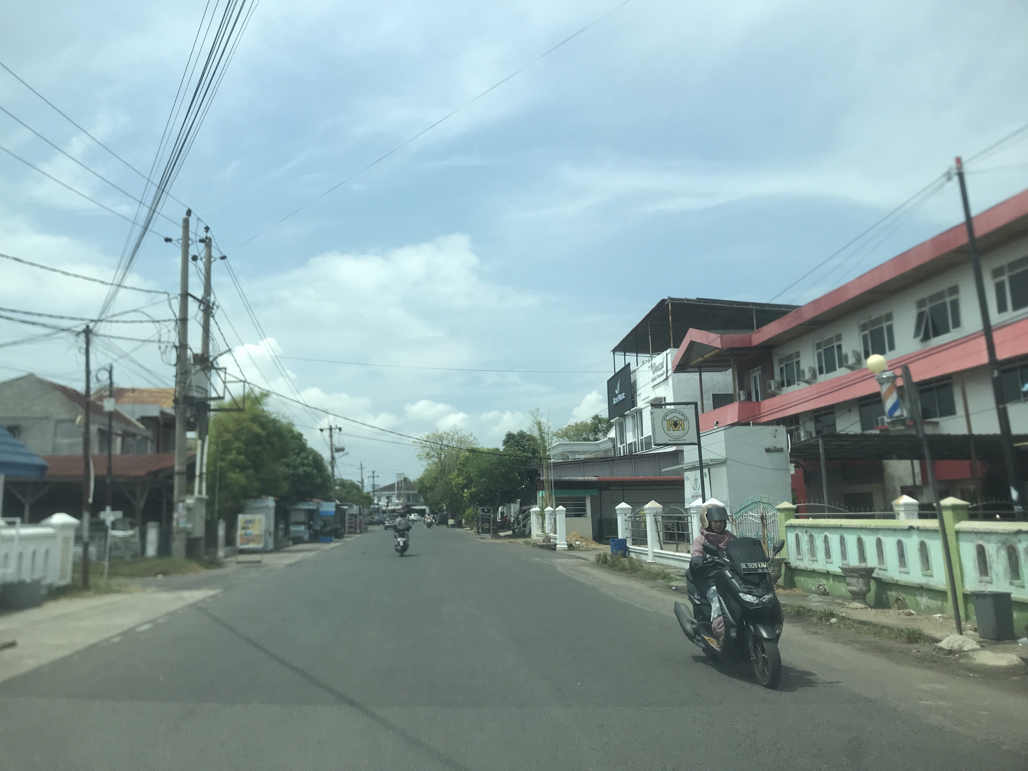 The image depicts a street scene in Lhokseumawe, Indonesia. A woman wearing a helmet and light-colored clothing is riding a black scooter towards the camera. The scooter's license plate is partially visible, displaying "BL 5129 KAV". In the background, another scooter is seen further down the road. The street is flanked by buildings, including a two-story building with a red-trimmed roof and a barber pole in front. There's another building with a sign containing the letters "KOI". Utility poles with power lines are visible along the left side of the road. The sky is partly cloudy. The overall impression is of a typical day in a residential or commercial area of Lhokseumawe.