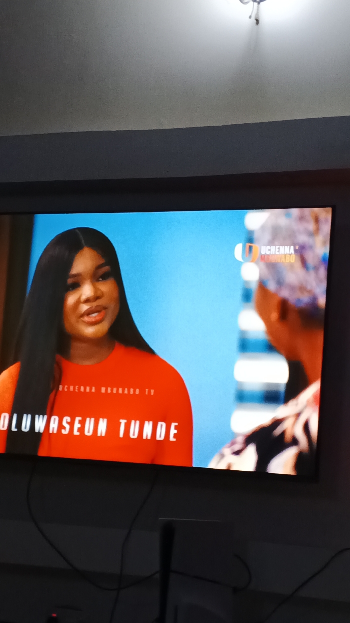 A television screen displays a woman with dark hair and a red shirt. “OLUWASEUN TUNDE” is in bold white text across the shirt. A logo in the upper right corner reads “UCHENNA MBUNABO TV.” The background is light blue. A person with obscured features and a colorful headdress is partially visible on the right side of the screen. The television is mounted on a wall with visible cables and a dark surface below the screen. A ceiling and a light fixture are also visible at the top of the image.