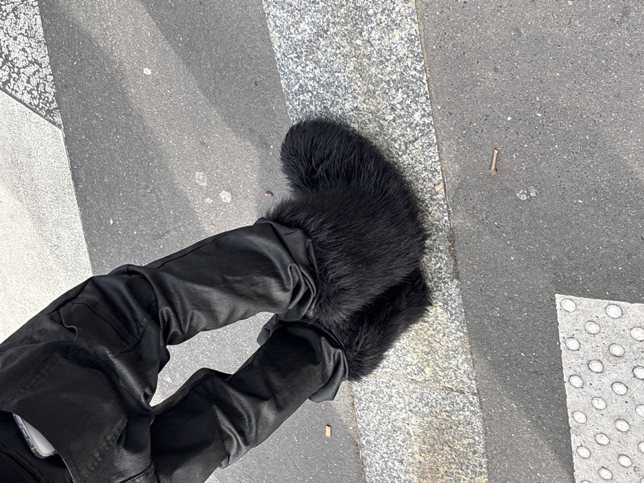 The image displays a close-up, downward view of a person's lower legs and feet on an urban sidewalk or street in Paris, France. The individual wears black, slightly glossy pants, heavily wrinkled at the ankles. A light-colored smartphone, possibly an iPhone, is partially visible in the left hip pocket. Both feet are shod in large, black, shaggy fur boots. The ground consists of dark asphalt, bordered by a light grey speckled granite curb or paving stones, and a section of light grey tactile paving with raised circular dots is visible in the lower left corner. A single cigarette butt lies on the asphalt near the left boot, and a small, dark brown twig-like object is visible further right on the asphalt. The scene is illuminated by natural daylight. The person appears to be standing still.