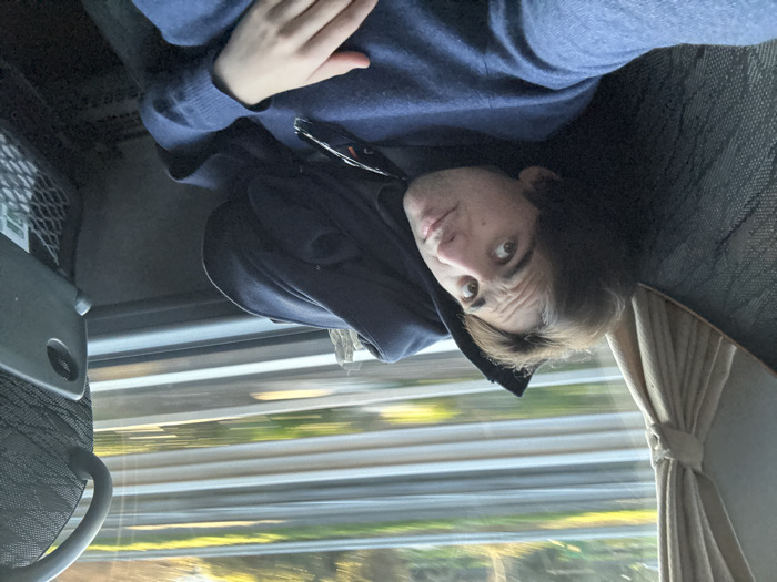 A male individual is depicted in a self-portrait taken inside a moving passenger vehicle, identified as a bus or coach