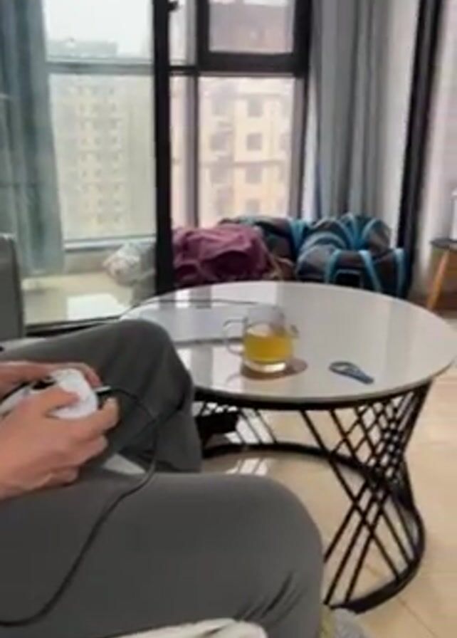A person is playing a video game, likely Monster Hunter, on a large flat-screen TV in a living room. The person is sitting on a couch, holding a white video game controller connected by a black cord. The game is visible on the TV screen, showing a battle scene with characters and monsters. The living room is bright, with a large window showing the outside, including other buildings. Next to the TV, there is a wooden TV stand, a white air purifier, and a PlayStation console. On the coffee table in front of the couch, there is a glass of a yellow liquid and a small white object. The person is focused on playing the video game, manipulating the controller with their hands.