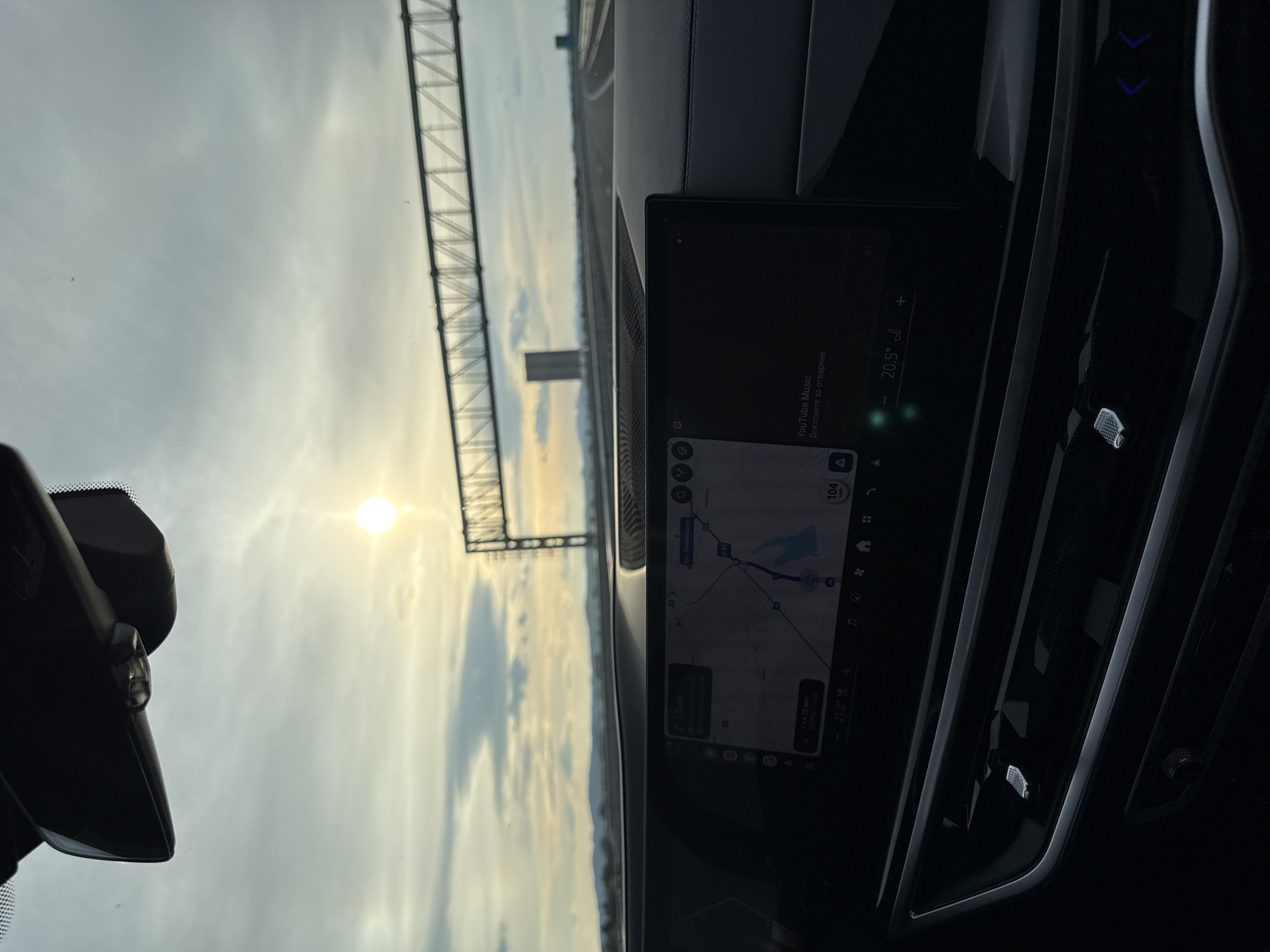 The image, taken from inside a car, shows a view of a highway in Mramor, Bulgaria. The sun shines brightly in the sky, visible through the windshield. An overhead highway sign structure is prominent in the view. The car's navigation system, displaying a map and driving directions along a route on Оmско шосе (Omsk Road), is visible on the dashboard. The system indicates a speed of 104 km/h, a temperature of 20.5°C and also shows music playing via YouTube Music.
