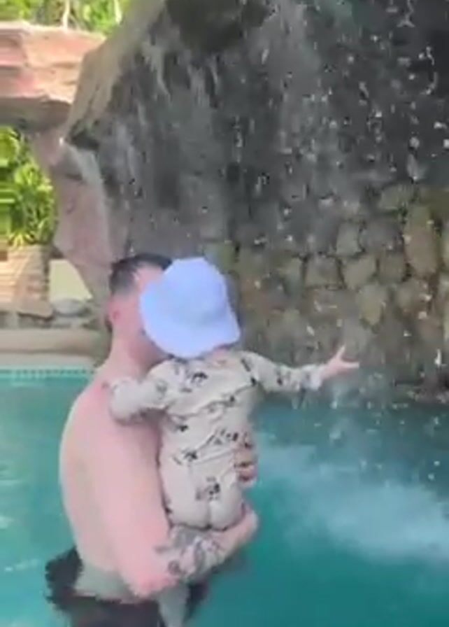 A shirtless man holding a baby in a light-colored, long-sleeve swimsuit and a white sun hat stands in a swimming pool in front of a man-made waterfall