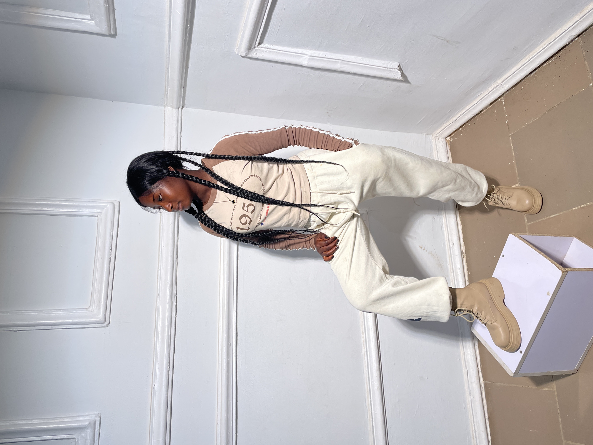 An individual stands in the corner of a room in Barakin Akawo, Nigeria. The subject is a young female with dark skin and long, multiple black braids. She is wearing a two-tone long-sleeve shirt, light beige on the torso with "195 ERA WORLD" text, and brown sleeves featuring white stripes. She wears light cream-colored sweatpants and light tan combat boots with thick soles. Her right foot is elevated, resting on a white, hollow wooden box. Her left hand is in her pocket, and her right hand is on her hip. Her head is turned to her left, looking away from the camera. The room features light-colored walls (off-white/pale blue-grey) with white decorative molding, including horizontal trim and rectangular panel outlines. The floor is tiled with large, rectangular light brown tiles.