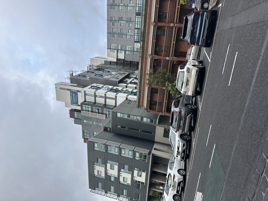 An outdoor, oblique street-level view captures a section of Carlton, Australia, under an overcast sky. The prominent subject is a large, multi-story modern building occupying the left and center of the frame, identified by a blue and white sign reading "COLLEGE SQUARE CAMPUS." This building features a complex, angular facade clad in dark grey, white, and blue panels, with numerous rectangular windows. Scaffolding is visible on its upper right side. Below and to the right, a row of two-story, red-brick Victorian-era buildings with ornate ironwork balconies is situated. To the far right, a simpler multi-story grey building with rectangular windows is partially visible. The lower half of the image depicts an asphalt road with white painted lines delineating parking bays and a green-painted section. A row of five vehicles is parked facing away from the viewer along the left side of the street: a white hatchback, a silver SUV, a dark grey SUV (license plate 1ZU 771), a white SUV (license plate ADF 304), and a dark blue SUV (license plate BLJ 293) parked diagonally on the right. Additional vehicles are partially visible in the distance. A single tree with green foliage is positioned in front of the brick buildings. The sky is uniformly grey and overcast. No individuals are visible, and no actions or interactions are depicted.