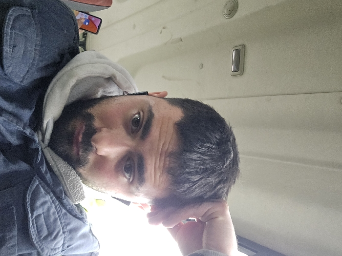 A close-up, slightly upward-angled selfie captures a male subject inside what appears to be a vehicle