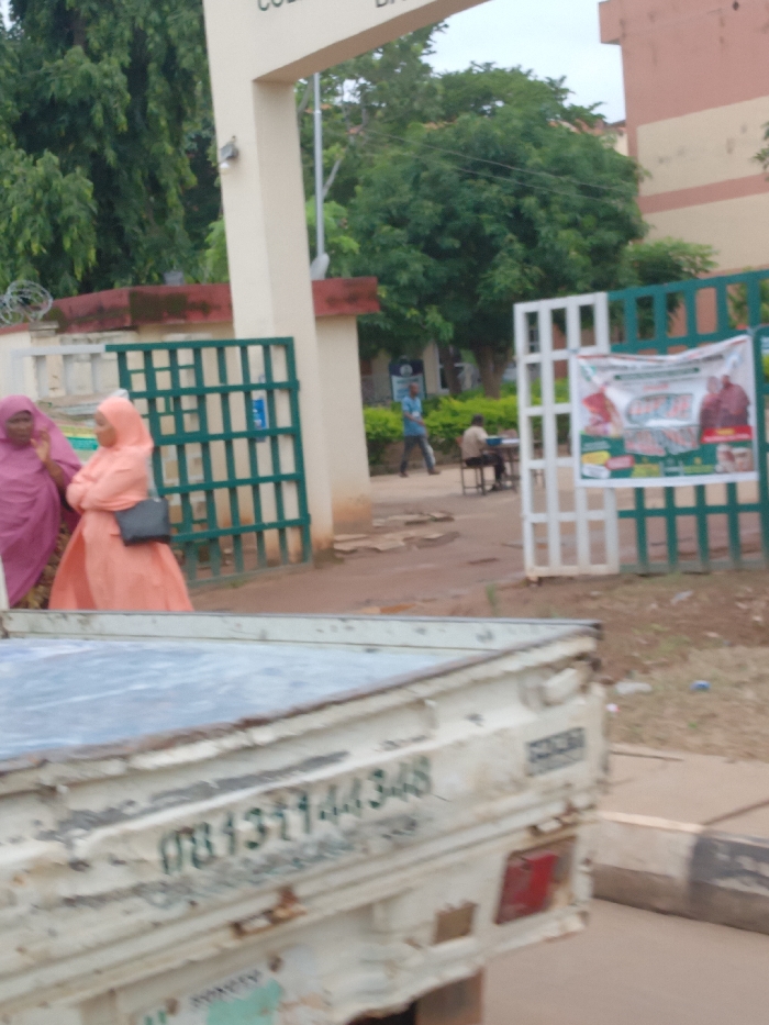 The image depicts an outdoor scene at the entrance of a facility, likely a college, in Barnawa, Nigeria, evidenced by the partial text "COLLEGE BA