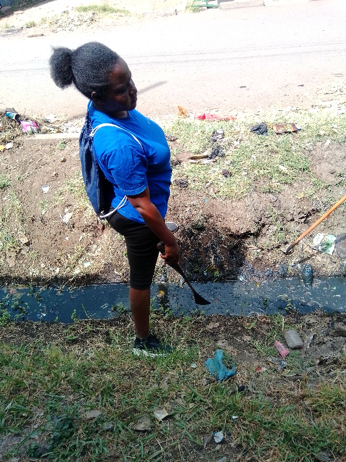 The scene is an outdoor urban environment in Nairobi, Kenya, under bright daylight. A single adult female stands on a grassy and muddy bank, positioned next to an open drainage ditch. She has dark skin, dark hair pulled into a ponytail, and is wearing a blue short-sleeved t-shirt, black capri pants, and dark athletic shoes with white soles. A dark blue drawstring backpack with white cords is on her back. She holds a long-handled, dark-bladed tool, resembling a hoe or spade, in her right hand, positioning it above the stagnant, dark liquid and debris within the ditch. Her head is tilted slightly, and her gaze appears directed towards the ditch. The ditch itself is narrow, filled with dark water and various pieces of litter, including a plastic bottle. Both the immediate bank where the woman stands and the opposite bank leading up to an asphalt road are heavily littered with plastic bags, paper, and other refuse. A light-colored wooden handle, possibly from another cleaning implement, is partially visible on the far bank to the right. The overall environment indicates an area with significant waste management challenges.