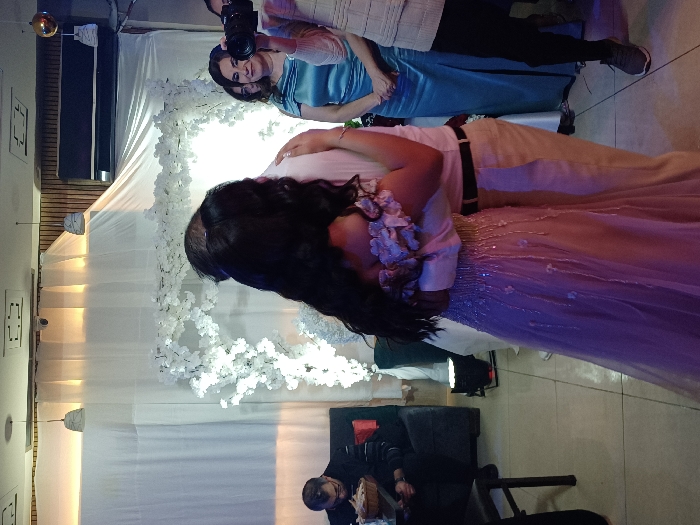 A couple embraces in front of a white floral arch. The woman wears a light pink gown with floral embellishments on the bodice. The man wears a light-colored suit with a dark belt. A woman with a camera stands to their left, wearing a blue dress. Seated in the foreground is a man in black attire. White draping and lighting create a bright backdrop. The scene appears to be at a wedding or formal event.