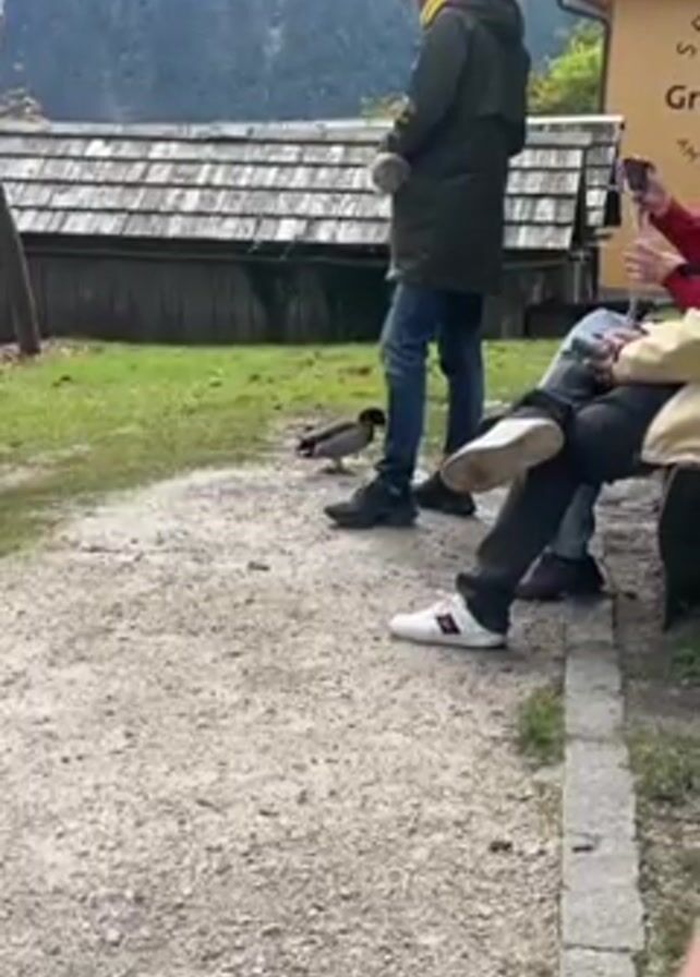 A medium shot shows a man standing near a walking path and bench in an outdoor setting. The man is wearing jeans, a green jacket, and dark sneakers. Another person is sitting on the bench, wearing white sneakers and dark pants. A duck stands on the walking path in front of them. The path is made of gravel and surrounded by grass. In the background are trees, a building with a wooden roof, and a mountain. Someone is holding a phone to take a picture. The man is talking, and the duck is standing still.
