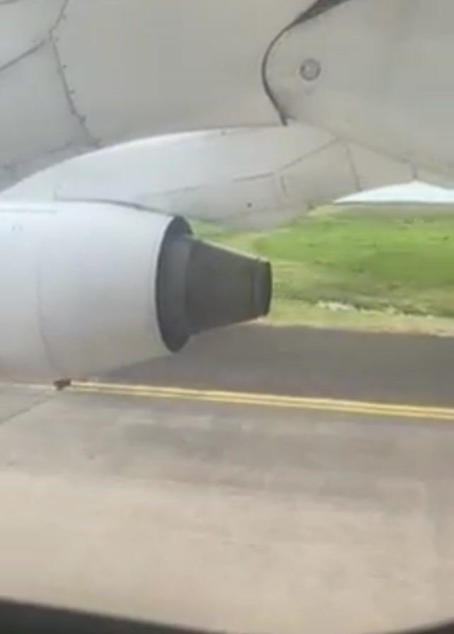 The video depicts the view from an airplane window of a wing and an engine as the plane taxis down the runway