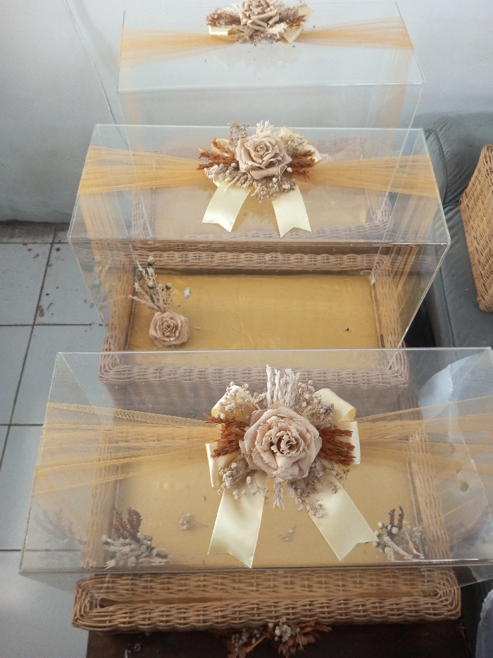 The image depicts four rectangular gift presentations, stacked vertically and observed from a high-angle perspective, within an indoor setting in Qarabucaq qəsəbə, Azerbaijan. Each presentation consists of a light brown wicker basket base with a golden-yellow lining, topped by a clear, transparent acrylic lid. The lids are adorned with a band of sheer golden-yellow fabric. Centered on each lid is an arrangement featuring a prominent dried beige or light brown rose, flanked by dried brown foliage and small white dried floral elements. Below this arrangement, a pale yellow satin ribbon is tied into a bow. Smaller, scattered dried floral components are visible on the golden-yellow lining inside the lower two clear lids. The immediate environment includes a light-colored wall and light-toned tiled flooring on the left, and a dark grey upholstered surface, possibly a sofa or chair armrest, along with a portion of an additional wicker basket on the right. No individuals, actions, or interactions are visible.