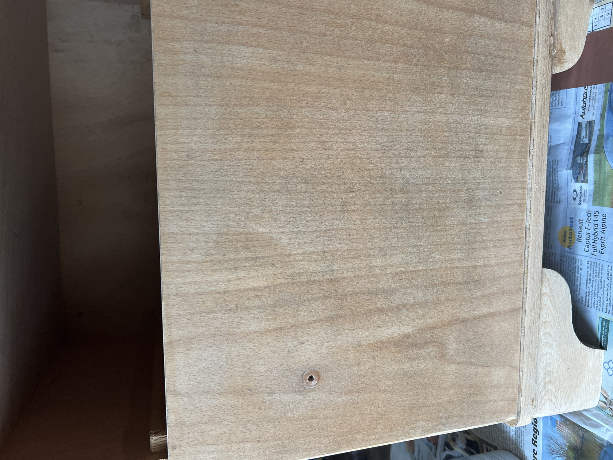 The scene is an interior view in Wüstenrot, Germany, depicting a light-colored wooden object. The prominent subject is the front panel of a wooden component, likely a drawer or cabinet section, constructed from plywood with vertical graining. A circular hole, approximately 1 cm in diameter, is present on the left side of this panel, positioned approximately one-third down from the top edge. Above the panel, the interior cavity of the component is visible, appearing dark and unlit. The wooden component rests on a lighter, contoured wooden base. Beneath this base, multiple sheets of German newspaper are spread out, displaying advertisements and text including "Renault Captur E-Tech Full Hybrid 145 Esprit Alpine" and "Autohaus". No individuals are visible. The setup suggests a temporary placement or work area.