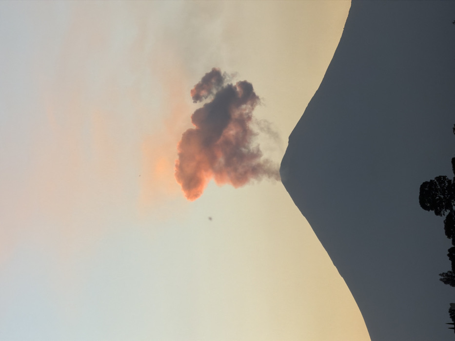 A sky gradient transitions from a pale yellow near the bottom to a light blue above. A plume of smoke, tinted with orange on its lower edges, rises. A darkened land mass with a steep incline occupies the upper right, punctuated by a few silhouetted trees along the bottom edge of the frame.