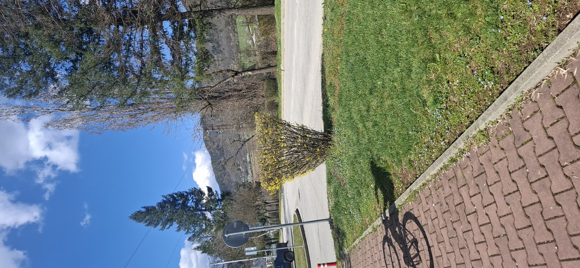 street scene in Pravets, Bulgaria. A paved red-brick sidewalk transitions to a strip of grass and then to an asphalt road. A yellow flowering bush grows alongside the road. A shadow of a person riding a bicycle is cast on the grass and sidewalk. Beyond the road, trees and a mountain are visible. A blue sky with scattered clouds is overhead. Street signs and utility poles are present.
