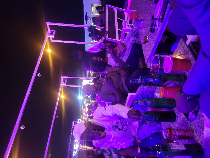A nighttime scene showcases a group of people at a table enjoying drinks. Illuminated by ambient lighting, the table is cluttered with bottles, glasses, and red solo cups. Several individuals are seated around the table, engaged in conversation. The setting appears to be an outdoor patio or rooftop area with decorative light fixtures creating a lively and social atmosphere.