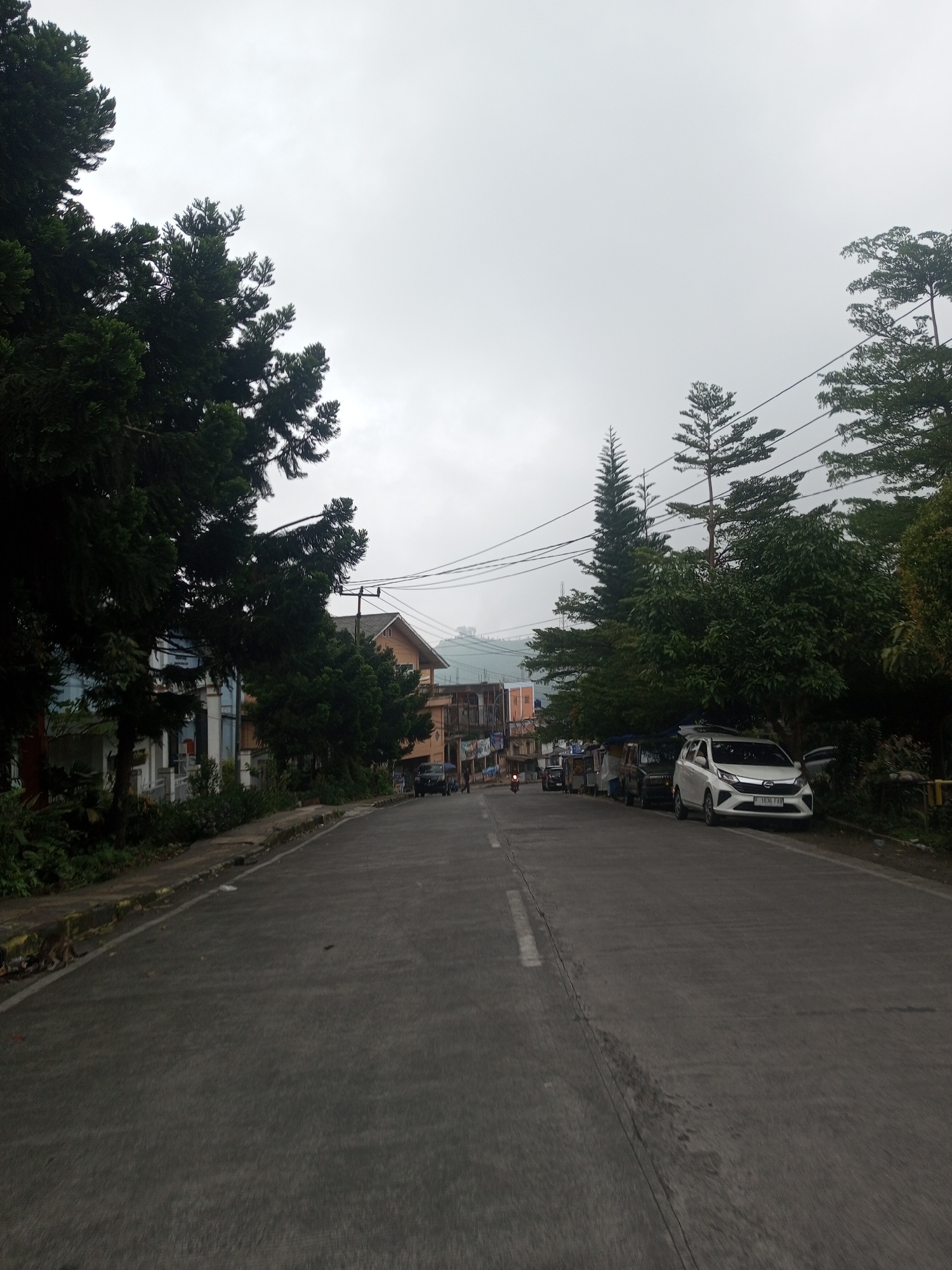 The image depicts an upward-sloping, asphalt two-lane road in Houaythat, Laos, under an overcast sky. The road features a faded white dashed center line and exhibits surface wear with visible cracks. On the left side of the road, dense, dark green evergreen trees line a concrete curb and an overgrown dirt strip. Behind these trees, multi-story buildings with varied facades, including light blue and white, are visible. Utility poles with overhead power lines are present, extending towards the background. On the right side of the road, a white multi-purpose vehicle (MPV) identified by license plate "D 1036 FAI" is parked parallel to the curb, partially beneath trees. The driver's side door of the MPV appears slightly open. Behind this vehicle, several street vendor stalls with dark coverings are positioned. Further along, another dark-colored vehicle is parked. This side also features numerous trees, including tall evergreens, and multiple utility poles supporting power lines that crisscross above the road. In the mid-distance on the road, a solitary motorcycle with an unidentifiable rider is observed moving away from the viewer. The background reveals distant hills or mountains, partially obscured by atmospheric conditions, with additional structures visible amidst the terrain. No direct human interactions are clearly discernible.