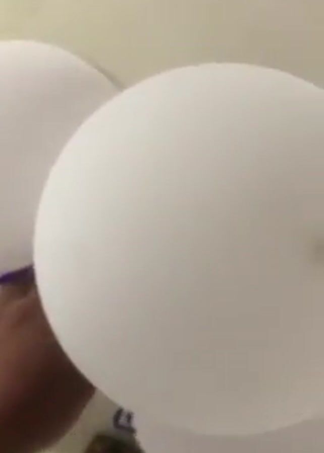 A hand arranges a cluster of white and purple balloons. The hand is dark-skinned and manipulates the balloons to create an arrangement, with white balloons forming the base and a purple balloon positioned on top. The balloons appear to be filled with air, and some are tied together with a purple ribbon. The background is a plain, light-colored wall.