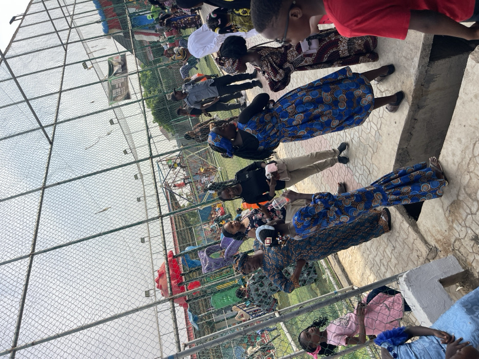 This image captures an outdoor daytime social gathering at a recreational facility or playground, located in the city of Jama A, Nigeria