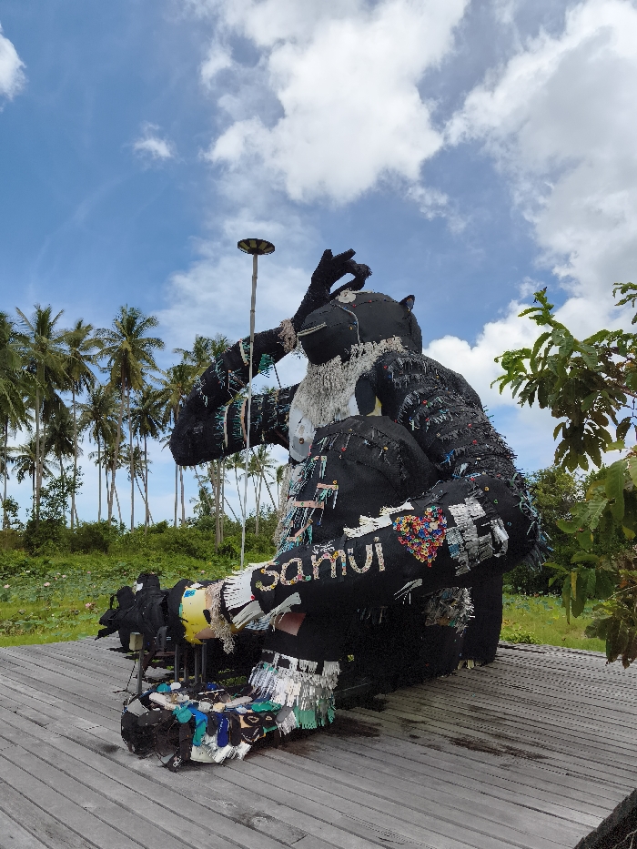 A large, seated, gorilla-like sculpture, constructed from black fabric and adorned with colorful embellishments, including the word "Samui." The sculpture is positioned on a wooden platform against a backdrop of palm trees and a blue sky with scattered clouds. A tall, slender light post stands nearby. The artwork is covered in recycled materials.