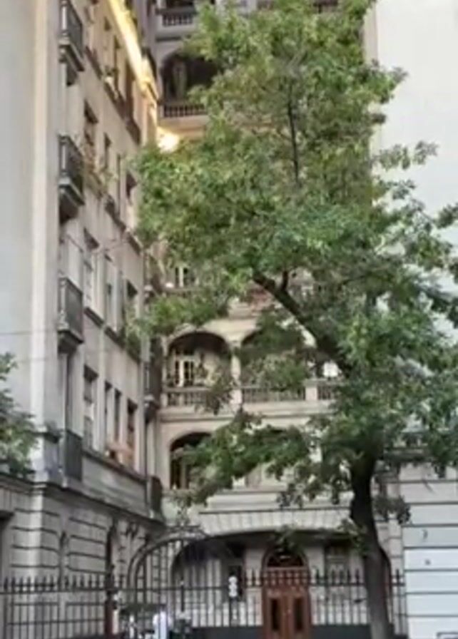 front of a large, multi-story building with an arched entryway. The building is made of light-colored stone, and the archway provides a view into an inner courtyard lined with balconies. A green tree partially obscures the view of the building's entrance and courtyard. A wrought iron fence and gate run along the front of the building, separating it from the street. A small section of the sidewalk is visible in the foreground, and a sign is attached to the right-hand side of the building. One person is visible inside the gate. The camera angle is looking upward, emphasizing the height and architectural details of the building.
