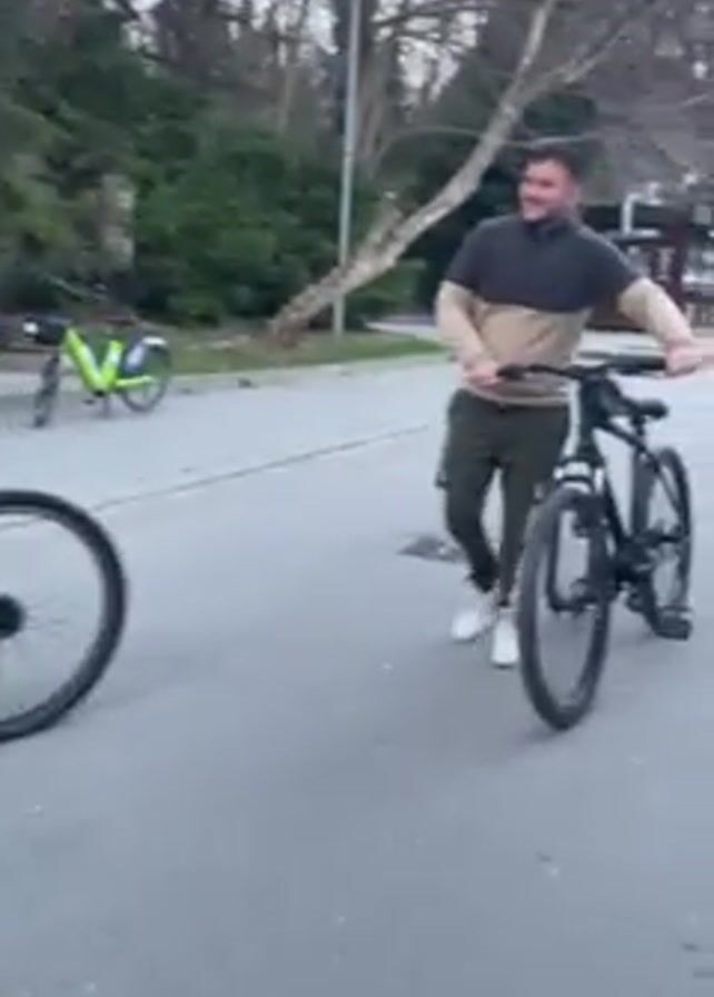 two men near bikes in a park. The first man, wearing a black hoodie and blue shoes, rides a red and black mountain bike. He stops and swaps bikes with the second man, who is wearing a grey and black top with white shoes. After the swap, the first man rides away on the second man's bike, and the other man walks alongside the camera. There are trees and other bikes visible in the background. The scene appears to be a park pathway.