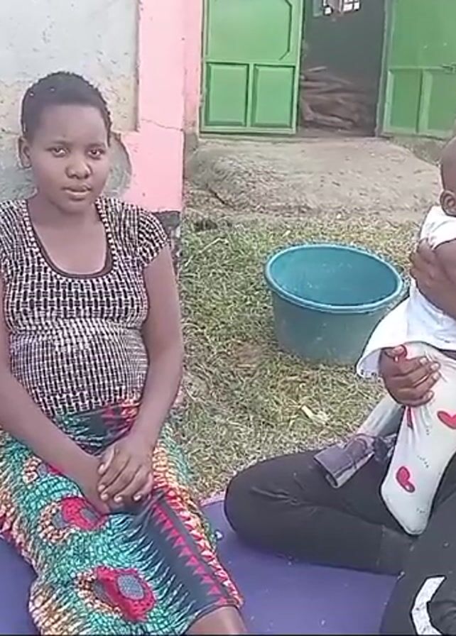 In an outdoor shot, a visibly pregnant woman sits on a blue mat. She wears a printed dress. To her right sits another woman holding a baby. The baby is eating something. The woman holding the baby wears a pink shirt and black pants. A green bucket is in the background. A building with a green door is also visible in the background. The pregnant woman laughs and points at the ground near her.
