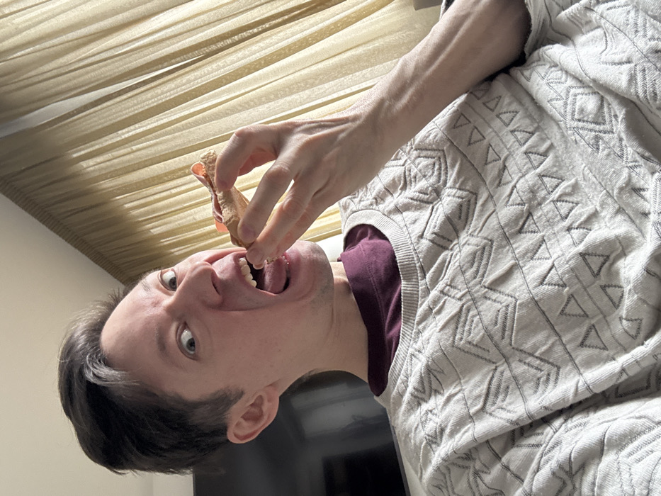 The scene depicts an adult male indoors in Boreti, Montenegro. The individual, possessing light skin and dark hair, is positioned from the chest up, facing the camera directly. He is wearing a light-colored, textured long-sleeve shirt with geometric patterns (chevrons and triangles), layered over a dark maroon t-shirt. His mouth is wide open, tongue visible, and eyes are wide, directed at the camera. He holds a small piece of bread or toast topped with a slice of cured meat in his right hand, positioned immediately in front of his open mouth as if about to consume it. In the background, to the left, a dark, rectangular object consistent with a turned-off television screen is partially visible. To the right, light-colored, vertically pleated curtains are present.