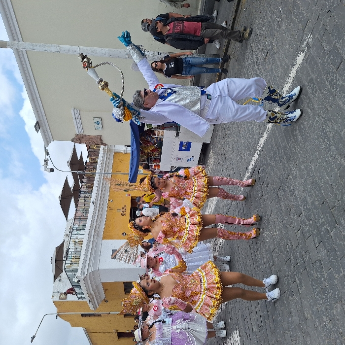 A group of people performs in a parade. A man in white costume dances with a scepter, wearing blue gloves and sunglasses. Behind him are several women in matching pink and gold costumes with white shoes and knee-high boots. The parade is on a cobblestone street lined with yellow and white buildings under a partly cloudy sky. Spectators are seen on the right.