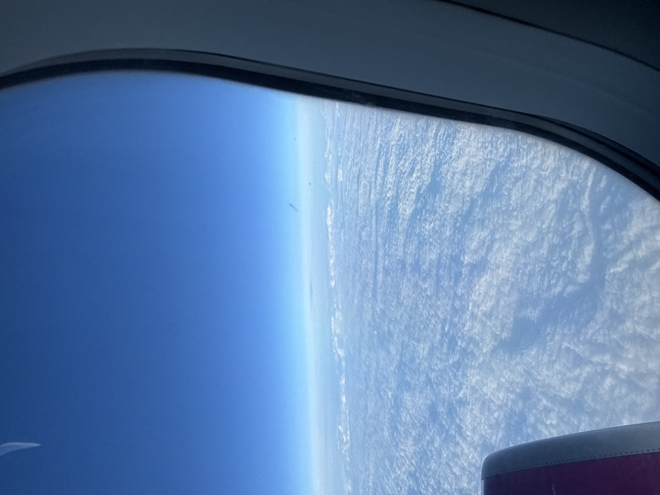 An aerial photograph, taken from inside an aircraft, depicts a high-altitude view over or in the vicinity of Caselle Torinese, Italy. The upper two-thirds of the image display a clear, deep blue sky, gradually lightening towards the horizon. Below this, a vast, unbroken expanse of white, textured cloud cover extends horizontally, obscuring all ground features. The right side of the frame is defined by the dark gray and black molding of an aircraft window. A curved, magenta-colored structural component, consistent with a portion of an aircraft engine nacelle or wing, is visible in the bottom-left quadrant. Minor specks and smudges are present on the window surface. No individuals, specific actions, or interactions are visible within the scene.