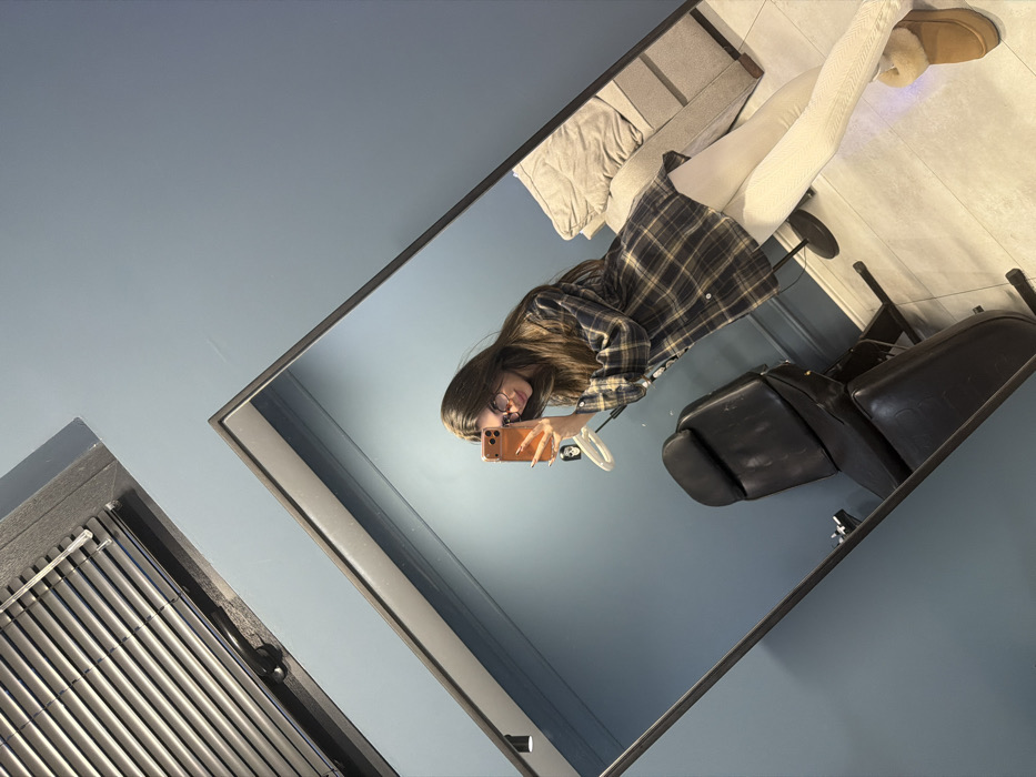 The image displays an interior room, likely a commercial establishment such as a studio or clinic, captured at an angle. The primary subject is a female individual reflected in a large, dark-framed, rectangular mirror. She has long, dark brown hair, wears eyeglasses, and is dressed in a dark brown and beige plaid button-up shirt, white textured leggings, and light brown Ugg-style boots. She holds a light orange-cased smartphone in her right hand, utilizing it to photograph her reflection. A white object is partially visible in her left hand. Within the mirror's reflection, to the left of the individual, a black adjustable reclining chair, possibly for tattoos or aesthetic treatments, is visible. To her right, a light-colored, upholstered sofa or bench is partially reflected. The room's walls are painted a solid light blue-gray. Outside the mirror's frame, in the upper left quadrant of the original image, horizontal window blinds are visible. The flooring appears to be light-colored tiles. Specific visual identifiers within the image to confirm its location in Yerevan, Armenia, are not present.