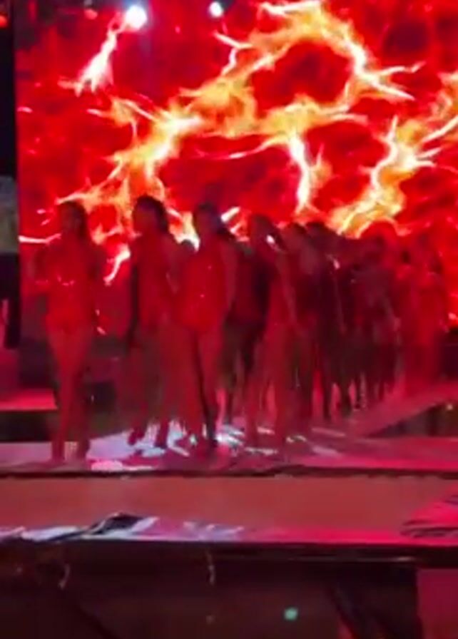 On a well-lit stage, a group of female dancers are performing a synchronized routine. The dancers are wearing similar red outfits. They are arranged in rows, moving in unison to the music. Behind them, a large LED screen displays a bright, abstract, red, and yellow background that resembles flames. The stage is elevated and surrounded by metal scaffolding. The video is taken from a low angle, looking up at the stage. There are a few lights visible on top of the scaffolding.