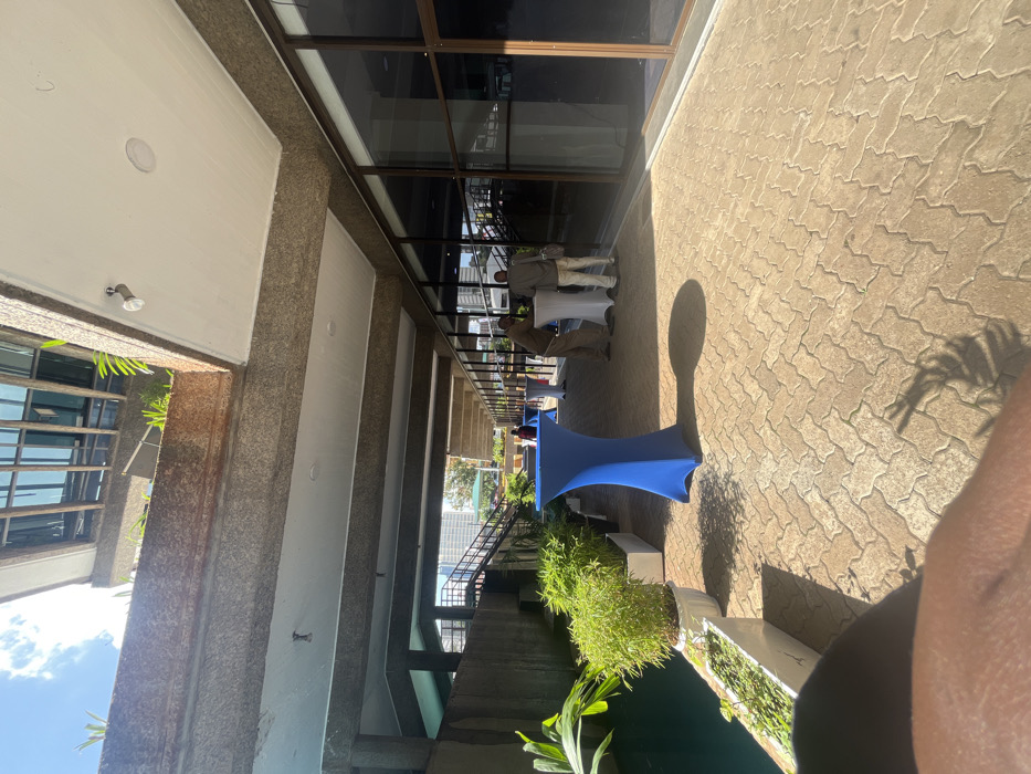 This image captures an outdoor covered walkway at the Kenyatta International Convention Centre (KICC) in Nairobi, Kenya, under bright daytime conditions