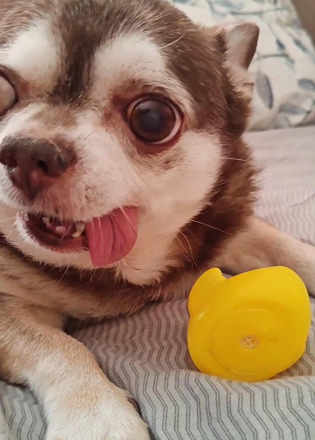 The scene features a brown and white Chihuahua dog lying on a gray striped bedspread. The dog has a slightly protruding tongue, and nearby lies a yellow rubber duck toy. The dog initially looks toward the camera, then shifts its gaze to the duck.