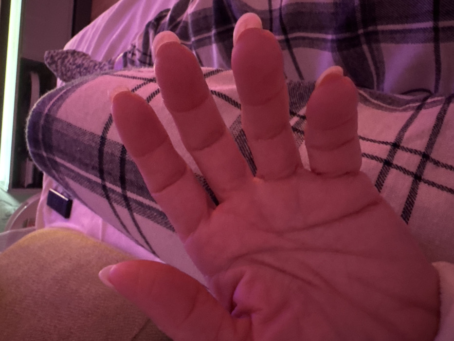 A hand, fingers extended, palm facing forward, rests on a lap