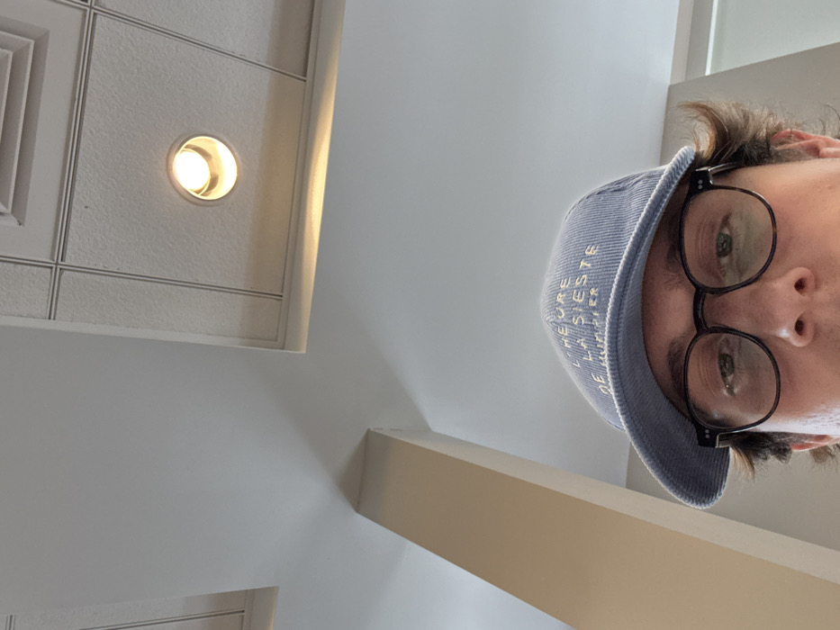 A person's face, primarily from the eyes downward, is visible in the foreground. The individual wears dark-rimmed circular glasses and a light blue corduroy baseball cap. The cap features embroidered white text, "L'HEURE DE LA SIESTE DE MINUIT" (The Hour of the Midnight Siesta). The person's eyes are open, looking directly forward. The background consists of an indoor environment with a white suspended acoustic tile ceiling. One circular recessed downlight, emitting a warm yellow glow, is active and positioned in the upper right quadrant of the image. Multiple structural elements are present: a light-colored pillar or wall section extends vertically on the left side, and another angled architectural feature is visible in the upper-left, both casting shadows. The walls appear light-colored, possibly off-white or beige. The setting suggests an indoor commercial or institutional building in Wellesley, United States. The specific establishment or address within Wellesley is not visually identifiable.