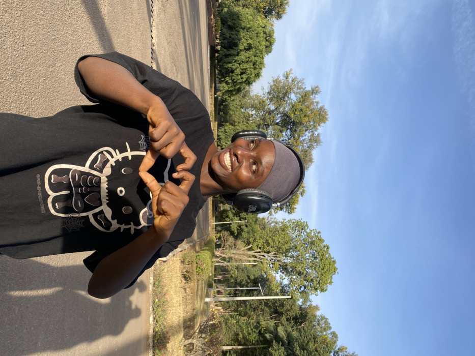 An individual is depicted outdoors under a clear blue sky in Vom, Nigeria. The subject is a young adult female with dark skin, wearing a grey head covering and black over-ear JBL headphones. She is dressed in a black short-sleeved t-shirt featuring a white graphic print of a skeletonized Hello Kitty figure with spiderweb accents. The individual is smiling broadly, exposing her teeth, and is forming a heart shape with both hands held in front of her chest. The background shows a landscaped area with numerous green trees and a paved surface in the foreground, with distinct shadows visible on the ground to the subject's right.