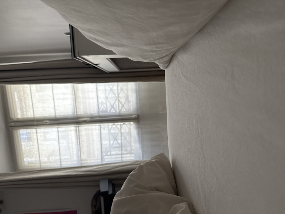 The image depicts an interior view of a room, likely a bedroom, looking out towards a large window. The perspective is low, originating from a bed covered with a light-colored, possibly white or off-white, sheet or duvet, which occupies the foreground. Two similarly colored pillows are partially visible on the left and right sides of the bed, framing the lower portion of the image. In the midground, a tall, double-panel window with light-colored frames is central. It is covered by sheer, translucent white curtains that filter incoming daylight. Thick, light-grey or beige drapes are pulled back, framing the window. Through the translucent window coverings, exterior details consistent with the city of Paris, France, are observable. Specifically, ornate metal grilles (ferronnerie) with a distinct criss-cross ("X") pattern are visible on the lower panes of an external window, a characteristic architectural element of Parisian buildings. Faint outlines of a stone building facade, typical of Haussmannian architecture, can also be discerned beyond the grilles. The ambient light suggests daytime conditions. To the left of the window, a dark object is partially visible on a white shelf, with a hint of a pink item on the wall. To the right, a white cabinet or dresser with dark objects on its surface is partially visible. No individuals are present in the scene, and no specific actions are occurring.